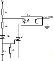 圖5為輸出過(guò)電壓保護(hù)電路。穩(wěn)壓管DZ的擊穿電壓稍大于輸出電壓額定值,輸出正常時(shí),DZ不導(dǎo)通,晶閘管V門極電壓為零,不導(dǎo)通。當(dāng)輸出過(guò)壓時(shí)DZ擊穿,V受觸發(fā)導(dǎo)通,使光耦輸出三極管電流增大,通過(guò)UC3843控制開關(guān)管關(guān)斷。