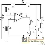 圖6為空載保護(hù)電路。為了防止變壓器繞組上電壓過(guò)高,同時(shí)也為了使電源從空載到滿載的負(fù)載效應(yīng)較小,開關(guān)穩(wěn)壓電源輸出端一般不允許開路。圖6中R2R3,給運(yùn)放同相輸入端提供固定的小電壓U+。R8為取樣負(fù)載電流的分流器,當(dāng)外電路未接負(fù)載RL時(shí),R8上無(wú)電流,運(yùn)放反相輸入端電壓U-=0,因而U+>U-,運(yùn)放輸出電壓較高,使三極管V1飽和導(dǎo)通,將電源內(nèi)部的假負(fù)載R7自動(dòng)接入。當(dāng)電源接入負(fù)載RL時(shí),R8上的壓降使U->U+,運(yùn)放輸出電壓為零,V1截止,將R7斷開。