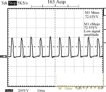 圖8~圖10為輸入電壓220V的條件下,輸出端的負(fù)載狀況分別為空載、半載和全載時(shí),輸入端的功率波形圖。由這3個(gè)圖可以看出,輸入功率是個(gè)脈沖序列,周期為10ms,即每半個(gè)工頻周期電源輸入端通過(guò)整流橋?yàn)檩斎肫交瑸V波電容充一次電。測(cè)量輸入功率時(shí)串聯(lián)于輸入端的采樣電阻為2.0Ω,因此功率為圖示值除以2。半載時(shí)輸出功率為:12.3662/10=15.29W,全載時(shí)輸出功率為:12.2552/5=30.04W。電路正常工作時(shí),漏極電壓波形如圖11所示。
