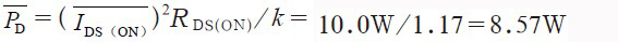 (3)若考慮到還有關(guān)斷損耗,從圖3中可查出PD=510mW=0.51W(UDS(OFF)=600V)。假定占空比為50%,在計算平均功耗時應(yīng)將關(guān)斷損耗除以2。因此PD=9.72W+0.51W/2=9.975W,該結(jié)果就與10.0W非常接近。