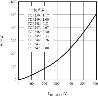 當(dāng)MOSFET關(guān)斷時漏極功耗P D與漏-源極關(guān)斷電壓U DS(OFF)的歸一化曲線如圖3所示。