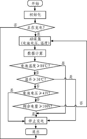 采用充電限壓,電池溫升檢測策略,如蓄電池電36 V,充電截止電壓42.5-43 V,充電截止溫度80℃,充電截止溫升30℃。不過絕大部分時間蓄電池基本處于欠充狀態(tài)。同時通過對電池電壓的數(shù)據(jù)實時采集,利用軟件控制對電池采取限壓保護(hù):通過實時計算電池電量進(jìn)行防過充過放保護(hù),電量為100%時停止充電,電量為20%時停止放電,為延長其壽命,做了第二道防線。圖1 為蓄電池過充保護(hù)流程圖。