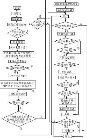 進(jìn)行太陽能路燈電池板電流檢測,蓄電池電壓檢測,蓄電池電量監(jiān)測,以及環(huán)境溫度的檢測,采用光開時關(guān),并實時上傳工作環(huán)境及狀態(tài)數(shù)據(jù),預(yù)警故障,保證系統(tǒng)的可靠性。圖2為太陽能路燈的開、關(guān)控制流程網(wǎng)。