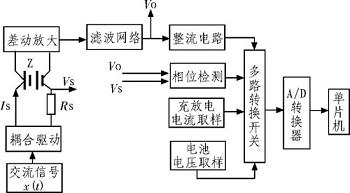 給電池施加一個固定頻率和固定電流(日前一般使用l kHz頻率、50 mA小電沆),然后對其電壓進(jìn)行采樣,經(jīng)過整流、濾波等一系列處理后通過運放電路計算出該電池的內(nèi)阻值。圖4為在線測量剩余電量硬件框圖。