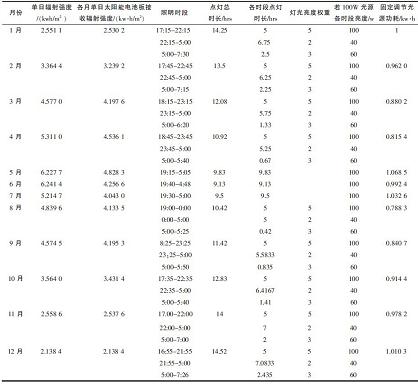 開關(guān)燈的時間根據(jù)天安門升降旗時間而定,如表1所示,全年最長點燈時長茌12月為14.52小時,最短為9.13小時。照明時間分為3個時段,第一個時段從當(dāng)天天安門降旗時刻開始,為5個小時,第二個時段到早上5點,第三個時段從5點到滅安門升旗時刻,燈光亮度各時段權(quán)重比為5:2:3,如果以100 W光源為設(shè)計標(biāo)準(zhǔn),則光源功耗最大為1.068 5 kW-h。