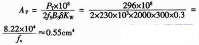 變壓器的實際輸出能力AP=Ae×Aw=0.55cm4,磁芯滿足設(shè)計要求。