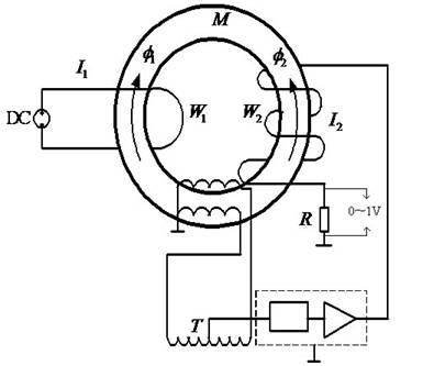 采用磁性比較方法,M為高導(dǎo)磁率材料鐵芯,、為比例繞組,、分別提供給、直流電流。得到的直流磁勢分別為, ,由于兩個(gè)磁勢和方向相反,當(dāng)時(shí),即鐵芯內(nèi)合成磁通為零時(shí),磁勢平衡方程為,且當(dāng)時(shí),.上述說明,即使是一個(gè)數(shù)值較大的單個(gè)電流,只要有足夠的匝數(shù),便可以用較小的與之平衡,并可用表示相應(yīng)的數(shù)值,數(shù)值較小,便于直接進(jìn)行精密測量,且為常量不受其他量的影響,因此用磁性比較方法測量直流大電流可以達(dá)到較高的精度。同樣風(fēng)速、太陽輻射量等信號的測量選用與光伏發(fā)電系統(tǒng)相配套傳感器和變換器將信號其轉(zhuǎn)換為標(biāo)準(zhǔn)電信號才能送入數(shù)據(jù)調(diào)理單元。
