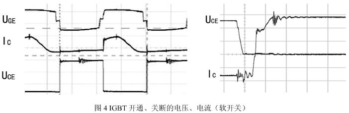 圖4 IGBT開通、關(guān)斷的電壓、電流(軟開關(guān)) 肖介光等:IGBT逆變焊機(jī)電磁騷擾的抑制 同時,由于主變壓器的漏感及分布電容在 IGBT 開通、關(guān)斷時,常常產(chǎn)生高頻高壓尖峰震蕩,由此而產(chǎn)生的高次諧波可由多種途徑傳入內(nèi)部電路,也可通過散熱器及主變壓器等途經(jīng)向空間輻射。