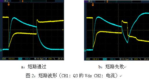 當控制器工作時,如電機短路,則會形成如圖1中所示的流經(jīng)Q2,Q3的短路電流,其電流值很大,達幾百安培,MOSFET的瞬態(tài)溫升很大,這種情況下應(yīng)及時保護,否則會使MOSFET結(jié)點溫度過高而使MOSFET損壞。短路時Q3電壓和電流波形如圖2所示。圖2a中的MOSFET能承受45us的大電流短路,而圖2b中的MOSFET不能承受45us的大電流短路,當脈沖45us關(guān)斷后,Vds回升,由于溫度過高,僅經(jīng)過10us的時間MOSFET便短路,Vds迅速下降,短路電流迅速上升。由圖2我們可以看出短路時峰值電流達500A,這是由于短路時MOSFET直接將電源正負極短路,回路阻抗是導(dǎo)線,PCB走線及MOSFET的Rds(on)之和,其數(shù)值很小,一般為幾十毫歐至幾百毫歐。
