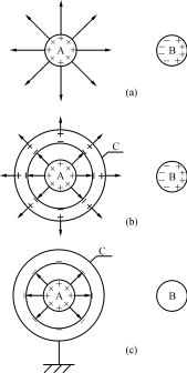 電場(chǎng)屏蔽是針對(duì)電場(chǎng)耦合所形成的干擾而采取的一種屏蔽措施。它是通過(guò)屏蔽體把干擾源(或需要保護(hù)的電路)封閉起來(lái),切斷電力線的通道,且必須把屏蔽體可靠接地。加裝屏蔽體實(shí)質(zhì)上是降低了干擾源與被保護(hù)電路之間的耦合電容。在圖1(a)中,未采取屏蔽措施,A和B之間存在耦合電容CAB;在圖1(b)中,雖然采取了屏蔽措施,但是屏蔽體卻未接地,它們之間仍然存在耦合電容CCB;在圖1(c)中,既采取了屏蔽措施,而且把屏蔽體接地,它們之間的耦合電容消失了。實(shí)踐中電場(chǎng)屏蔽的方法有兩種,第一種是用接地的屏蔽體包圍干擾源,它可以有效地切斷電力線的延伸,從而避免對(duì)其它電路形成的干擾;第二種是用接地的屏蔽體包圍需要保護(hù)的電路,形成一個(gè)有效的“潔凈”空間,從而避免了來(lái)自外界的電場(chǎng)耦合干擾。圖1從(a)到(c)的演示過(guò)程說(shuō)明“屏蔽罩”和“接地”之間的密切關(guān)系。只加“屏蔽罩”,而不“接地”是毫無(wú)意義的。