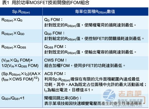 為使DC-DC轉(zhuǎn)換中采用的MOSFET技術(shù)達(dá)成最佳化,首先須確定對(duì)目標(biāo)應(yīng)用的性能造成影響的關(guān)鍵元件參數(shù)為何。透過功耗機(jī)制分析得出的這些參數(shù)通常為一組關(guān)鍵效益因數(shù)(性能指標(biāo)),在確認(rèn)任何效益因數(shù)的有效性為實(shí)際限值(如可用尺寸和成本)時(shí),功耗分析所采用的假設(shè)前提相當(dāng)重要。表1列出了用于新的功率MOSFET技術(shù)研發(fā)的FOM。