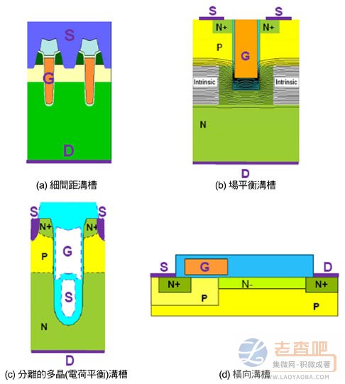 圖1標(biāo)示出目前常用的多種功率MOSFET元件結(jié)構(gòu)。圖1a中所示的高密度溝槽結(jié)構(gòu)采用較低的Sp.RDS(on),但QG和QGD較高,因?yàn)榇藘蓚€(gè)參數(shù)與單元密度成正比。此種結(jié)構(gòu)通常用于開關(guān)損耗較無重要性的應(yīng)用中(如電池保護(hù))。可透過加大單元間距、于溝槽底部加上厚氧化膜以改善此結(jié)構(gòu)的開關(guān)性能。