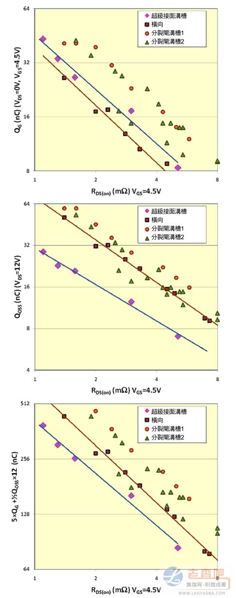 采用QOSS與QG加權(quán)組合作為性能指標(biāo)的優(yōu)點(diǎn)如圖3所示,其中QG、QOSS及其組合分別針對(duì)三個(gè)不同的30伏特功率MOSFET結(jié)構(gòu)產(chǎn)生RDS(on)函數(shù)。趨勢(shì)線的斜率反映不同的FOM。請(qǐng)注意:由于數(shù)據(jù)來自于資料手冊(cè),因此數(shù)值包含封裝電阻。由圖3可知,相較于超級(jí)接面和分裂閘溝槽技術(shù),橫向技術(shù)的QG更佳。由于超級(jí)接面結(jié)構(gòu)在元件閘極和連接源極的漏極遮罩電極間增加了CGS,因此QG值低于分裂閘技術(shù)。