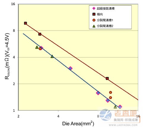 圖4 針對(duì)不同的功率MOSFET結(jié)構(gòu),晶片面積與RDS(on)的關(guān)系。