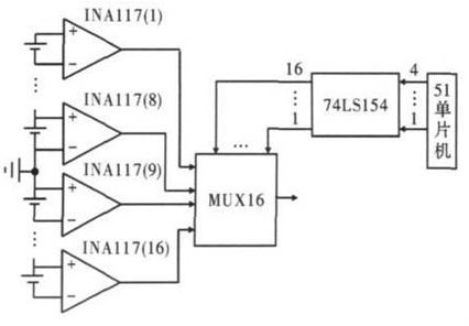每節(jié)鋰離子電池最高電壓為5 V,由圖3 可得,第1 個(gè)INA117 的3 腳的輸入電勢(shì)最高為40 V.同理,第16 個(gè)INA117 的2 腳輸入電勢(shì)最低為- 40 V.第1 至8 個(gè)INA117 的輸出電壓為正,第9 至16 個(gè)INA117 的輸出電壓為負(fù),所以多選一模擬開關(guān)和A/D 轉(zhuǎn)換器都要求可以輸入正、負(fù)電壓。多選一模擬開關(guān)選用MUX16,為16 選1 可正負(fù)電壓輸入模擬開關(guān),因此16節(jié)電池只需1 個(gè)MUX16.但由于單片機(jī)IO 口有限,文中用一片74LS154 擴(kuò)展了IO 口,僅用單片機(jī)的4 個(gè)IO 口即可控制MUX16 分別選通單節(jié)鋰離子電池進(jìn)行電壓采樣。