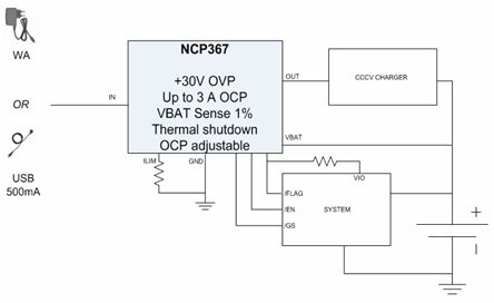 以NCP367為例,這是一款提供+30 V過(guò)壓保護(hù)及高達(dá)3 A過(guò)流保護(hù)、帶電池電壓檢測(cè)功能的保護(hù)IC(見(jiàn)圖5)。這器件保護(hù)便攜設(shè)備電池免受輸入過(guò)壓(在出現(xiàn)故障工作條件下會(huì)斷開系統(tǒng)與Vbus或AC-DC適配器的連接)、充電過(guò)流及充電過(guò)壓影響。NCP367提供最大值100 mΩ的低導(dǎo)通阻抗,幫助降低方案成本及電路板占用空間。支持高達(dá)3 A電流的能力幫助實(shí)現(xiàn)快速充電。典型值50 μA的極低電流消耗兼容于USB 500 μA閑置模式。這器件能用于1.5 A或500 mA兩種充電電流等級(jí),非常適合手機(jī)等應(yīng)用。