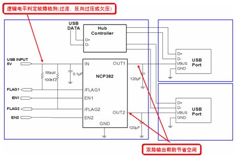 NCP382則是一款功率分配開關(guān),其設(shè)計(jì)針對(duì)很可能會(huì)遇到大的電容性負(fù)載或短路的應(yīng)用。實(shí)際上,越來(lái)越多便攜電子設(shè)備采用USB供電,但需要保護(hù)本地USB電源夠用受外部Vbus故障影響。NCP382能夠通過(guò)在輸出負(fù)載超過(guò)限流閾值或出現(xiàn)短路時(shí)切換至恒流模式,將輸出電流限制在期望的電平(0.5 A、1 A或1.5 A),從而提供過(guò)流保護(hù)。NCP381接收2.5 V至5.5 V的單路輸入,提供2路輸出。圖6是NCP382的典型應(yīng)用電路圖。
