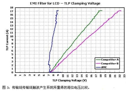 在靜電放電事件的高導(dǎo)通電流下,瞬時電壓抑制器的箝位電壓越低則越能適時地被導(dǎo)通,以使受保護電路免于遭受靜電放電的侵害而永久受損失效。圖3所示為利用傳輸線脈沖產(chǎn)生系統(tǒng)(TLP)所量得的箝位電壓比較圖。由圖中可以清楚看到,晶焱科技應(yīng)用于液晶顯示器的電磁干擾濾波器,在17安培的高靜電放電電流下具有最低的箝位電壓,可以非常有效地提供受保護電路一個快速有效的靜電放電旁通路徑。