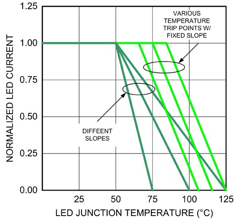 為防止組件遭受破壞或讓使用壽命縮短,必須進行熱能管理,且已有多種方法可以解決此問題。圖2為兩種不同的回折曲線,可在溫度上升時限制LED的電流流量。當(dāng)接面溫度保持在默認溫度范圍內(nèi)時,就經(jīng)由主要的控制回路作為電流調(diào)節(jié);但當(dāng)接面溫度超過默認范圍時,就會使用另一組控制回路限制電流大小。其中接面溫度的回折點與驅(qū)動電流的衰減率,均可依照不同的應(yīng)用和LED制造商的建議改變。