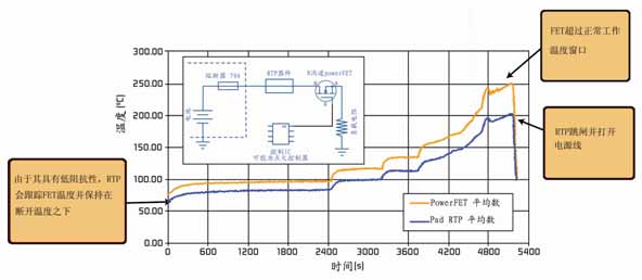 圖2. 在一次慢性熱失控情況下,RTP器件會(huì)跟蹤powerFET溫度,直到它在200°C時(shí)斷開電路。