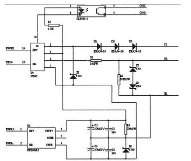 逆變器驅動電路采用日本三菱公司為驅動IGBT設計的專用集成電路M5 7962L,加少量外圍元件構成。N87C196MC輸出SPWM信號通過外圍電路放大后直接給驅動模塊,驅動模塊直接驅動IGBT管,最大可驅動400AIGBT。當M57962L檢測到IGBT管上C、E極電壓高與8V,而且此時IGBT管開通時,持續(xù)時間大于2.5 μ s,則發(fā)出故障信號,同時封鎖驅動波形,并且發(fā)出故障信號給N87C196MC,單片機產(chǎn)生EXTINT中斷,封鎖各路SPWM信號,高速關斷IGBT。