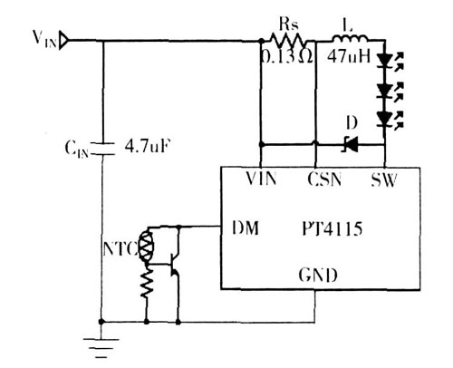 對(duì)于PT4115 具有動(dòng)態(tài)溫度調(diào)節(jié)的功能,并且,可以在此功能的基礎(chǔ)上實(shí)現(xiàn)過(guò)溫保護(hù)。