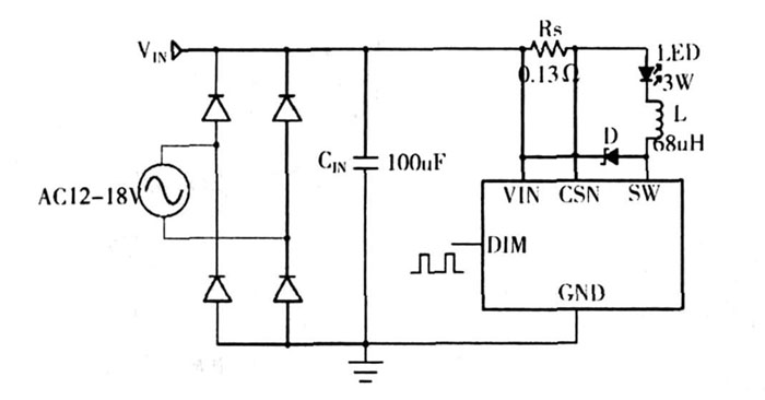 對(duì)于PT4115 (見(jiàn)圖4) 即可以應(yīng)用于12~18 V 的交流,也可應(yīng)用在8 V~30 V 的直流。因此,應(yīng)用范圍更加廣泛。并且,驅(qū)動(dòng)電路簡(jiǎn)單,所需元器件均價(jià)格低廉。適合批量、市場(chǎng)化。
