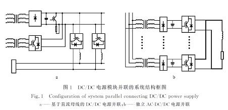 圖1b所示的拓?fù)浣Y(jié)構(gòu)可保證每個(gè)AC-DC/DC電源模塊的獨(dú)立性,即可實(shí)現(xiàn)直流電源裝置的并聯(lián),能夠根據(jù)實(shí)際的電壓,電流及功率的要求自由地增減模塊的個(gè)數(shù)!在實(shí)際應(yīng)用中有很大的空間,有一定的研究?jī)r(jià)值。但這種拓?fù)浣Y(jié)構(gòu)也有它不利的一面!即若變壓器輸出電壓略有差別,則每個(gè)整流模塊的輸出電壓將不同,從而造成各整流模塊輸出電流嚴(yán)重不平衡。