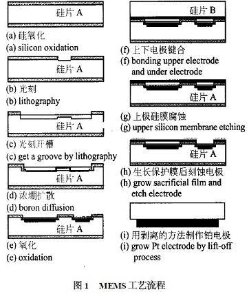 硅電容式壓力傳感器的敏感元件是半導(dǎo)體薄膜,它可以由單晶硅、多晶硅等利用半導(dǎo)體工藝制作而成。典型的電容式傳感器由上下電極、絕緣體和襯底構(gòu)成。當薄膜受壓力作用時,薄膜會發(fā)生一定的變形,因此,上下電極之間的距離發(fā)生一定的變化,從而使電容發(fā)生變化。但電容式壓力傳感器的電容與上下電極之間的距離的關(guān)系是非線性關(guān)系,因此,要用具有補償功能的測量電路對輸出電容進行非線性補償。由于高溫壓力傳感器工作在高溫環(huán)境下,補償電路會受到環(huán)境溫度的影響,從而產(chǎn)生較大的誤差?;谀P妥R別的高溫壓力傳感器,正是為了避免補償電路在高溫環(huán)境下工作產(chǎn)生較大誤差而設(shè)計的,其設(shè)計方案是把傳感器件與放大電路分離,通過模型識別來得到所測環(huán)境的壓力。高溫工作區(qū)溫度可達350℃。傳感器件由鉑電阻和電容式壓力傳感器構(gòu)成。其MEMS工藝如下:
