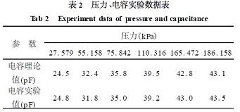 1可見,擬合的電容誤差小于1%。由此可見,在不同的時刻測得UO(t),通過曲線擬合得出參數(shù)RC。再給電路加小信號直流電源,測出R值,即求得C,通過C值則可知被測環(huán)境的壓力。圖5為350℃時,不同的壓力所對應(yīng)的電容的理論值和實驗值,從實驗數(shù)據(jù)(表2)可得,在測壓的過程中,利用模型識別的方法,誤差較小,其測壓誤差小于2%。