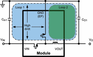 在規(guī)劃電源布局時,首先要考慮的是兩個開關(guān)電流環(huán)路的物理環(huán)路區(qū)域。雖然在電源模塊中這些環(huán)路區(qū)域基本看不見,但是了解這兩個環(huán)路各自的電流路徑仍很重要,因為它們會延至模塊以外。在圖1所示的環(huán)路1中,電流自導通的輸入旁路電容器(Cin1),在高端MOSFET的持續(xù)導通時間內(nèi)經(jīng)該MOSFET,到達內(nèi)部電感器和輸出旁路電容器(CO1),最后返回輸入旁路電容器。