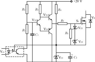 設計的驅動電路如圖5所示,它由驅動脈沖放大和5V基準兩部分組成。脈沖放大包括光耦Vo1,R1和R2,中間級的VT1,推挽輸出電路VT2和VT3,對高頻干擾信號進行濾波的C1;5V基準部分包括R4,VZ1和C2,它既為MOS管提供-5V的偏置電壓,又為輸入光耦提供副邊電源。其工作原理是:
