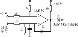 過流保護是利用SG3524的腳10加高電平封鎖脈沖輸出的功能。當腳10為高電平時,SG3524的腳11及腳14上輸出的脈寬調制脈沖就會立即消失而成為零。過流信號取自電流互感器(對SG3524-1芯片串接在工頻變壓器的副邊,對SG3524-2芯片串接在濾波電路前),經整流后得到電流信號加至如圖6所示過流保護電路上。過流信號加至電壓比較器LM339的同相端。當過流信號使同相端電平比反相端參考電平高時,比較器將輸出高電平,則二極管D2將從原來的反向偏置狀態(tài)轉變?yōu)檎驅ǎ淹喽穗娢惶嵘秊楦唠娖?,這一變化將使得電壓比較器一直穩(wěn)定輸出高電平封鎖脈沖,則Boost電路停止工作,在正常狀態(tài)下,比較器輸出零電平,不影響B(tài)oost電路工作。