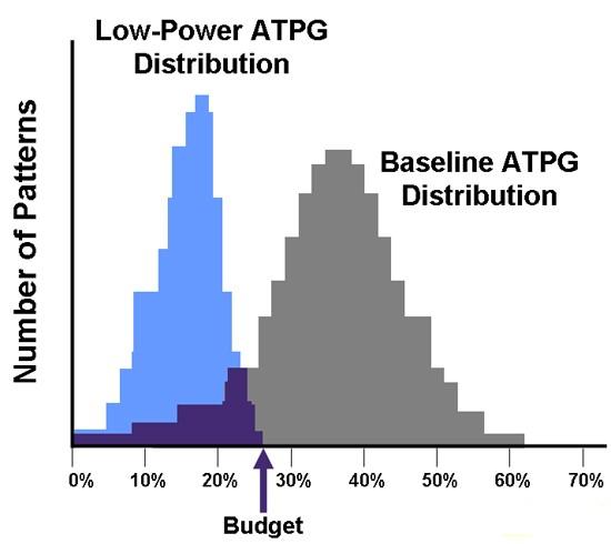 然而,如果我們采用相關(guān)技術(shù)降低測試期間的功耗,我們就能有效地將這種分布向左移。在圖1中重疊的藍色低功率分布區(qū),掃描ATPG向量的峰值開關(guān)活動沒有超過功率預(yù)算,因此降低了制造測試中功率問題產(chǎn)生的風險。