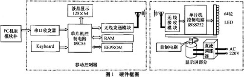 顯示屏主要由單片機控制電路、一列64位超高亮度LED組成的列點陣、電機3部分組成。