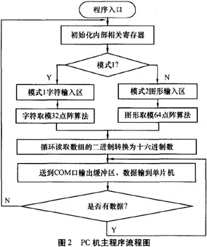 軟件采用實時的方式取模:數(shù)據(jù)圖形—數(shù)據(jù)。通過引入圖形這個中間量,使得提取字模變得靈活,無論任何字體、符號,都可以實現(xiàn)即時轉(zhuǎn)換。Pc機軟件主程序流程圖見圖2。