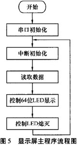 由單片機控制LED的亮滅和無線數(shù)據(jù)的接收.數(shù)據(jù)通過無線模塊接收后,單片機的串行接口收到數(shù)據(jù)并傳到主控芯片AT89S8252中處理,當有無線數(shù)據(jù)傳到時,優(yōu)先處理接收數(shù)據(jù).顯示屏主程序流程圖見圖5。無線數(shù)據(jù)接收子程序流程圖見圖6。顯示屏能否清晰顯示內(nèi)容主要從以下幾方面考慮:1)單片機控制LED的亮滅時間:T=S/V,S為LED面寬度,為電機轉(zhuǎn)動線速度;2)電機轉(zhuǎn)動時軸心保持平衡;3)環(huán)境光線對比度。