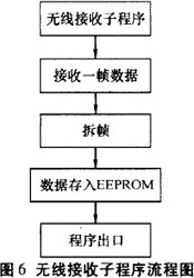 程序上電初始化后,處于等待狀態(tài)。當串口中斷一來I臨,優(yōu)先處理串口中斷.發(fā)送無線數(shù)據(jù)是通過鍵盤、菜單控制。移動控制器主程序流程圖見圖3;無線發(fā)送子程序見圖4。