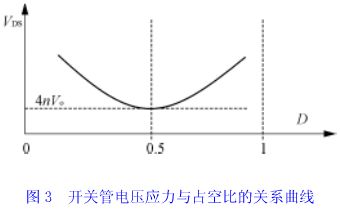 上式說明,當(dāng)變壓器匝比愈小時,對于一定的輸入電壓和輸出電壓的變換器,開關(guān)管電壓應(yīng)力vds愈小。所以,有源鉗位正激變換器一個顯著優(yōu)點(diǎn)是可以降低開關(guān)管電壓應(yīng)力,從而可選用額定電壓較低、通態(tài)電阻較小的功率開關(guān)管。另外,當(dāng)變壓器變比n確定后,開關(guān)管電壓應(yīng)力僅與占空比有關(guān),如圖3所示。顯然,當(dāng)占空比為0.5時,開關(guān)管承受最小的電壓應(yīng)力。當(dāng)輸入電壓變化時,如果將占空比設(shè)計運(yùn)行在以0.5為中心的對稱范圍內(nèi),則可使開關(guān)管承受的電壓應(yīng)力基本保持恒定。