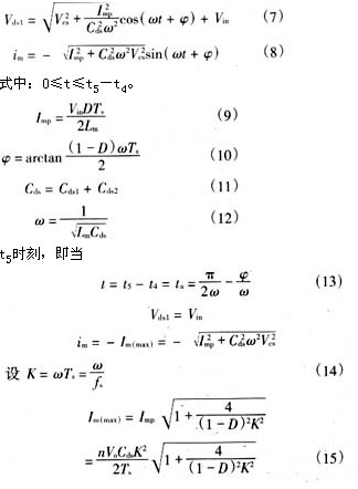 從上面的分析可明顯地看出,當(dāng)變壓器勵磁電感l(wèi)m減小,勵磁電流足夠大時,[t5~t0′]期間勵磁電流除了能提供負(fù)載電流外,剩余部分可用來幫助電容cds2、cds1充放電。電壓vds1有可能諧振到零,從而實(shí)現(xiàn)主功率開關(guān)管s的零電壓軟開通。二極管d1可為負(fù)的勵磁電流續(xù)流。關(guān)鍵工作波形如圖2(b)所示,具體的軟開關(guān)條件將在下一節(jié)中詳細(xì)討論。很顯然,軟開關(guān)的代價是變壓器勵磁電流和開關(guān)管導(dǎo)通電流峰值大幅增加,開關(guān)管及變壓器電流應(yīng)力和通態(tài)損耗明顯加大。