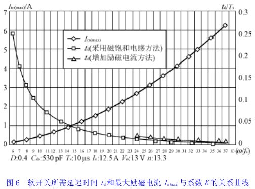 死區(qū)延遲時間,意味著pwm變換器有效占空比的損失。為了盡量減小有效占空比的損失,則k必須加大。另一方面,變換器開關(guān)頻率fs愈高,則為保持相同的有效占空比,k至少應(yīng)保持不變,即諧振頻率ω應(yīng)與開關(guān)頻率fs成比例增加。圖6給出了軟開關(guān)所需要的死區(qū)時間td和最大勵磁電流im(max)與k的關(guān)系曲線。從圖中明顯看出,采用加大勵磁電流的方法實(shí)現(xiàn)零電壓軟開關(guān)和采用磁飽和電感器比較,要求的k較大,因而有較大的勵磁電流損耗;另外,從式(15)看出,開關(guān)頻率愈高,電流峰值也愈高,變壓器的銅耗和開關(guān)管的導(dǎo)通損耗也愈大。因此,軟開關(guān)有源鉗位正激變換器工作頻率不宜太高。