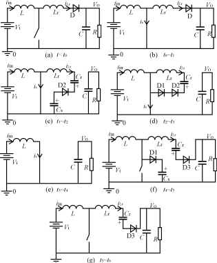 子電路包括一個(gè)電感Lr,兩個(gè)電容Cs、Cr,三個(gè)二極管D1、D2和D3。Lr提供主開關(guān)零電流開通條件,限制二極管D的反向恢復(fù)電流。電容Cs提供開關(guān)零電壓關(guān)斷條件。電容Cr為電感Lr能量恢復(fù)提供能量。這種變換器有七種運(yùn)行模態(tài)。假設(shè)各種元器件為理想元器件,且Cs<Cr。下面對(duì)其進(jìn)行分析。
