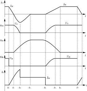 從t5開始,vcs被鉗在VO,即VCsmax=VO;電源繼續(xù)經(jīng)L,Lr,Cr,D3向負(fù)載供電,電容Cr繼續(xù)放電。t=t6時(shí),電容電壓vcr降到零,同時(shí)電感電流iLr上升到Iin,iLr=Iin,簡(jiǎn)化電路如圖2(g)所示,波形圖如圖3所示。