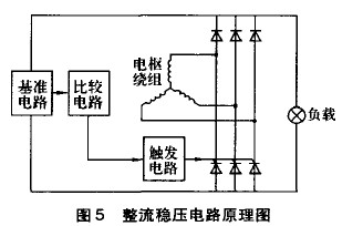 設(shè)計的釹鐵硼永磁發(fā)電裝置結(jié)構(gòu)示意圖如圖4所示,還研制了三相半控橋整流穩(wěn)壓電路(圖5)。該電路由三相半控橋整流電路、電壓信號取樣電路和觸發(fā)電路組成。當發(fā)電機輸出電壓低于目標穩(wěn)壓值時,電子穩(wěn)壓器為三相整流輸出。當發(fā)電機輸出電壓高于目標穩(wěn)壓值時,電壓信號取樣電路自動使三相半控橋整流電路瞬時斷開,降低輸出電醫(yī)當發(fā)電機輸出電壓再低于目標穩(wěn)壓值時,三相半控橋整流電路再恢復(fù)工作,周而復(fù)始。通過整流、斬波,保證了發(fā)電機輸出電壓穩(wěn)定的直流電。