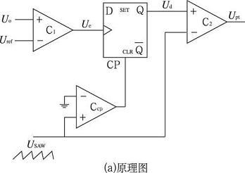 本節(jié)設(shè)計(jì)一種簡單實(shí)用的脈沖序列控制器, 如圖2 所示。圖2 中時鐘信號CP( Clock Pulse) 由峰峰值為- 10 V到+ 10 V 的鋸齒波信號USAW 與電壓信號UGN D ( UGND = 0) 通過比較器Ccp產(chǎn)生; 變換器輸出電壓Uo 與基準(zhǔn)電壓Uref 通過比較器C1 產(chǎn)生電壓信號Ue;觸發(fā)器D 在時鐘來臨時刻將電壓信號Ue 傳遞至輸出端Q, 并在下一時鐘來臨之前保持不變; 比較器C2 將D 觸發(fā)器的輸出信號和鋸齒波進(jìn)行比較產(chǎn)生控制脈沖PH 或PL 實(shí)現(xiàn)對變換器的控制。