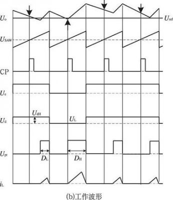上述PT 控制器的工作過程為: 在開關(guān)周期的起始時刻, 時鐘信號CP 來臨, 若此時Uo > Uref , 則Ue 為高電平; 時鐘信號同時使觸發(fā)器D 觸發(fā), 觸發(fā)器輸出信號Ud 在下一時鐘脈沖來臨前保持高電平不變; 鋸齒波信號USAW 與Ud 經(jīng)過C2 比較, 輸出占空比為DL的低能量脈沖信號P L.若Uo< Uref , 則Ue 為低電平;觸發(fā)器輸出信號Ud 在下一時鐘脈沖來臨前保持低電平不變; 鋸齒波信號USAW 與Ud 比較產(chǎn)生占空比為DH的高能量脈沖信號PH .PT 控制器主要工作波形如圖2( b) 所示。
