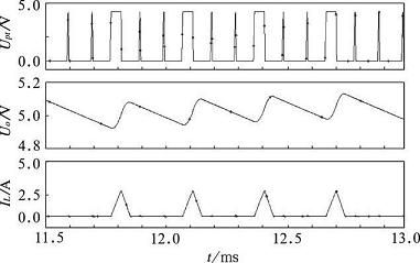 由圖3 可知, 輸出電壓Uo 的紋波隨著電感電流I L 的變化而變化??刂菩盘柮枯敵鲆粋€高能量脈沖,輸出電壓紋波值增大;輸出低能量脈沖時, 輸出電壓紋波值減小, 但是其值始終在5 V 上下范圍內(nèi)波動。仿真結(jié)果與實(shí)驗(yàn)設(shè)計(jì)要求一致。