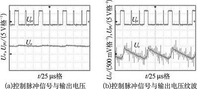 從圖4( a) 中, 可以看出當(dāng)MOSFET 管導(dǎo)通控制信號為高能量脈沖占空比為DH 時, 輸出電壓Uo 有小幅上升;而MOSFET 管導(dǎo)通控制信號為低能量脈沖占空比為DL 時, 輸出電壓Uo 有小幅下降, 與仿真波形圖一致。在圖4( b) 中,可觀察輸出電壓Uo 的紋波圖, 能夠更清楚地反映開關(guān)管導(dǎo)通控制信號與輸出電壓的變化關(guān)系。從圖中,可以更加明顯看到開關(guān)管導(dǎo)通控制信號的變化對輸出電壓的影響, 與仿真結(jié)果基本一致。
