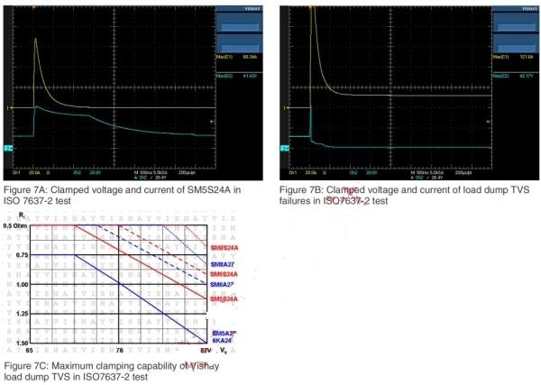 在具有13.5V Vbatt和400ms脈寬的ISO-7637-2 pulse 5測(cè)試條件下,Vishay甩負(fù)荷TVS的最大鉗位性能如圖7C所示。為防止出現(xiàn)圖7B中的失效,需要充分考慮TVS的最大定額。