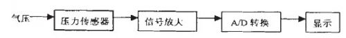 下面以測量輪胎氣壓為例詳細(xì)闡述氣壓傳感器在汽車輪胎方面的應(yīng)用。此種設(shè)計(jì)可做成一種便攜式的裝置,測量時將氣壓傳感器的表置于輪胎氣門嘴上,這時胎壓作用于傳感器的膜片上,通過壓阻效應(yīng)和系列變換輸出微弱的電壓信號,將電壓信號進(jìn)行相應(yīng)處理顯示電壓值。由此可知不同的氣壓對應(yīng)著不同的電壓值,即氣壓值和電壓值是一一對應(yīng)的,從而間接測量了氣壓值。胎壓測量電路方框圖如圖4所示。